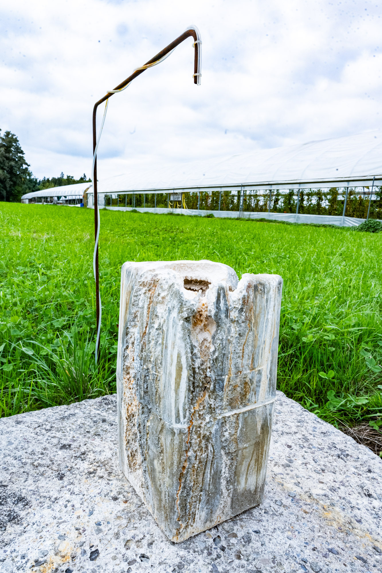 Hunter Longes Projekt reflektiert die Zyklen von Leben und Tod und zeigt auf, wie lebendige Organismen und fossile Überreste geologische Materialien wie Kalkstein formen. Er setzt menschliche und geologische Dimensionen in Beziehung und fragt nicht zuletzt auch nach den gesellschaftlichen Machtstrukturen, welche ähnlich der baulichen Strukturen, der Entropie, der Auflösung wie auch der Heilung unterliegen, und wie Spuren aus der Vergangenheit, die durch diese Kräfte geformt wurden, unser Heute prägen. Prozesse wie Biomineralisation und organischer Zerfall tragen auf dem Hof zu einem stetigen Materialkreislauf bei – und lassen die Grenzen zwischen Belebtem und Unbelebtem, Biologischem und Mineralischem verschwimmen. 2025 zeigte der Künstler erste Tests seines zweijährigen Projekts zum Thema der Erosion bzw. Auflösung von Kalkstein (und Beton, der aus Kalkstein gewonnen wird) sowie zur „Selbstheilung“ antiken römischen Betons. Daraus entstanden sich wandelnde Skulpturen, die sich allmählich auflösen oder selbst reparieren. 2026 führt der Künstler seine Forschungen weiter, um einen vertieften Einblick in die Mineralogie und die biomineralische Schnittstelle auf dem Bauernhof zu gewinnen. Als Ausgangspunkt dient recycelter Beton aus Bauabfällen als Basis für eine sich wandelnde, erodierende Skulptur. Wasser respektive die lokalen Quellen dienen als wichtigen Bestandteil der bio/geochemischen Reaktionen und Prozesse des Auf- und Abbaus von Materie. Das Projekt verbindet ästhetische Bezüge zu Kalksteinlandschaften und Bestattungspraktiken mit einer kritischen Auseinandersetzung mit ökologischen Fragen. Im Dialog mit Geologie, Architektur und Chemie entstehen Ansätze für nachhaltigere Materialien – und Reflexionen darüber, wie sich Prozesse von Auflösung und Erneuerung auch auf gesellschaftliche Systeme übertragen lassen.