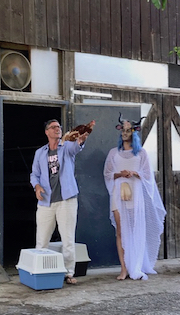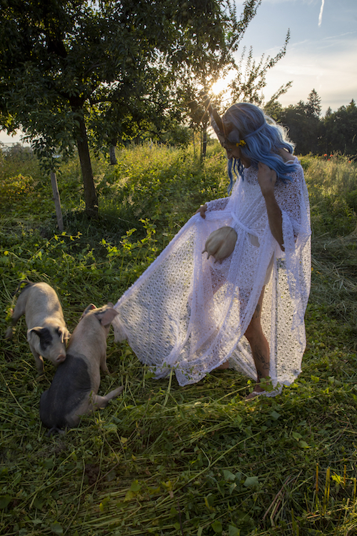 Die sex-positive, feministische und vegane Drag-Kuh Soya, das Al- ter Ego von Daniel Hellmann, sprengt die Grenzen von Gender und Spezies. In ihrer Performance bewegt sich Soya an der Schnittstelle von Aktivismus, Theater und Kunst und greift so in die Struktur des Hofs ein, rettet sechs Hühner und siedelt diese vom Hof Blum auf zwei Lebenshöfe um. In einer zweiteiligen Performance singt Soya für eine Welt voller Freude und Mitgefühl und fordert den Landwirt Martin Blum zu einem Gespräch heraus. Einem Appell gleich, spre- chen sie über die Rolle des Huhns auf dem Hof und die Möglichkeiten weg von einer industriell geprägten Landwirtschaft – in der männ- liche Küken vergast oder zerschreddert und alle Legehennen nach einem Jahr getötet werden, weil die Eierproduktion abnimmt – hin zu einer nachhaltigeren und auf Pflanzen basierten Landwirtschaft