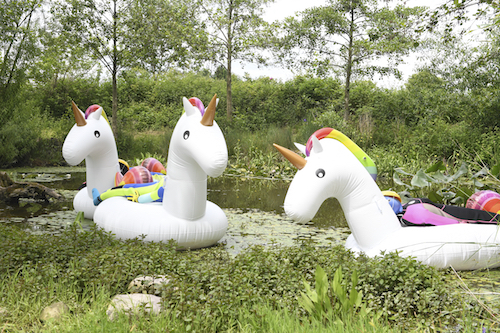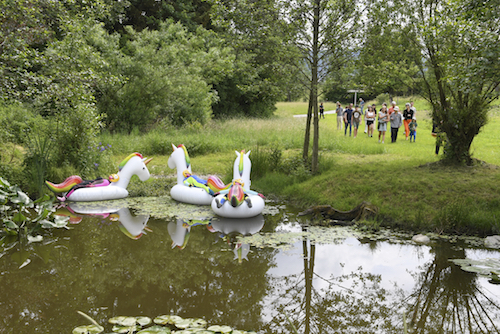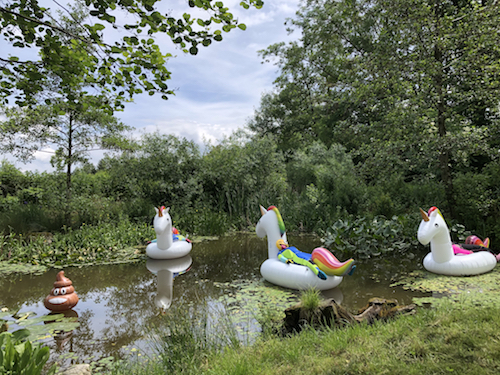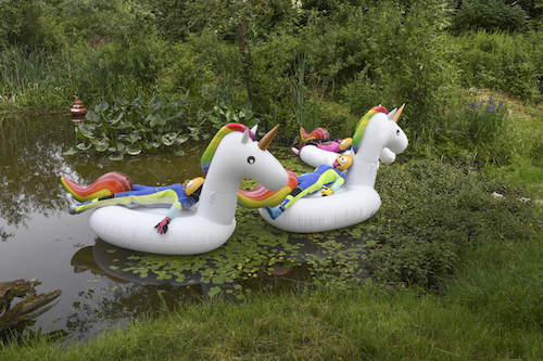 Es ist äusserst erfreulich, dass ich dank der Galerie Nicola von Senger ein Werk von Breuning auf meinem Hof ausstellen kann. Die Arbeit „Floating Maniacs“ von 2019 passt in vielerlei Hinsicht zum diesjährigen Ausstellungskonzept: Das Werk bemächtigt sich der allgegenwärtigen Zeichensprache der Emoticons. Es zeigt neben einem expliziten Misthaufen auch das omnipräsente Einhorn auf welchem eine zugedröhnte Plastikfigur liegt. Selbst Scheisse ist niedlich sofern sie aus Plastik oder noch besser digital ist. Aber gerade in dieser Zeit zeigt sich das beiläufig hingeworfene Kommentare keineswegs immer harmlos sind.