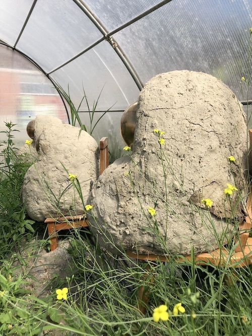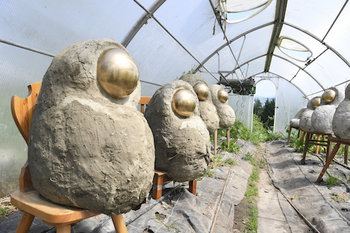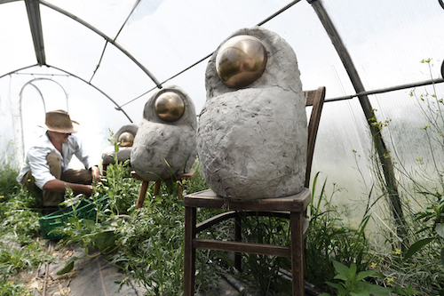 Die Arbeit „the long nap“ von Pedro Wirz reiht sich in einem Kanon von Werken ein, welcher sich mit Larven, Kokons und Eiern beschäftigen. Im Treibhaus sind acht Larven auf Stühlen scheinbar seriell platziert. Manche sind fetter als andere und eine scheint nahezu implodiert zu sein. Ruhend scheinen sie auf ihre Metamorphose zu warten. Ganz wie die sogenannten Kryoniker, welche ihre Körper, oder einzelne Organe, nach ihrem Tod in flüssigem Stickstoff einfrieren, um dann in ferner Zukunft zu einem neuen Leben erweckt zu werden. Im Larvenstadium sind viele Insekten besonders anfällig, deshalb setzen gewisse Insektizide sogenannte Häutungshemmer hier an indem sie den Prozess mit Hormonen oder mit Nervengift stören. In „the long nap“steckt ausserdem eine gehörige Prise Science-Fiction. Die kreisrunden „Augen“ der Kreaturen erinnern an Visiere von Raumanzügen. Vielleicht wäre es am einfachsten verpuppte Larven auf die Reise ins All zu senden?