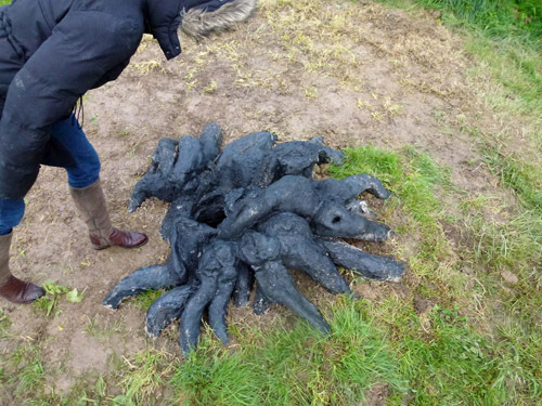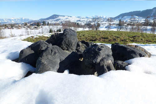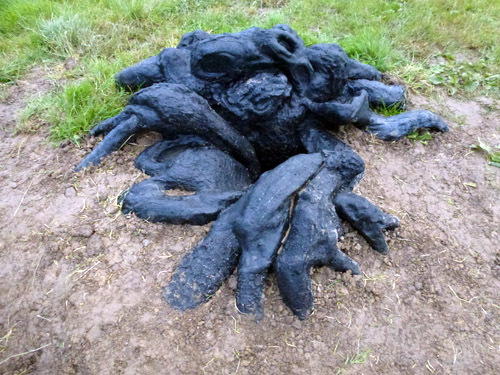 Eine zweite Fassung ist aus schwarzem Epoxydharz, halbnaturalistisch, halb ausserirdisch. Der lebensgrosse Baum, der gleichsam durch sich selbst hindurch in die Erde hinunterwächst – «halb Baumstrunk, halb Vulkankrater» (Claudia Spinelli) – war in unterschiedlichen Outdoor-Settings zu sehen.