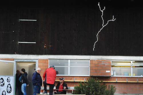 und „Opposite Affinity“ 2024, Leuchtröhre an der Scheunenwand