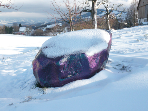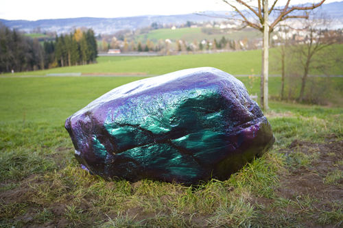Ihr geheimnisvoller „Findling (Vanity N0.1)“ wiegt drei Tonnen und stammt aus dem Urner Reusstal. Er wurde versiegelt mit zwanzig Schichten Karosserielack. Der von den Künstlern verwendete Lack ist ein hochmodernes und sündteures Pigmentgemisch, das gewöhnlich getunte Boliden ins rechte Licht rückt: Je nach Lichteinfall und Standort des Bewunderers oszilliert die Farbe von knalligem Violett bis zu sattem Grün.