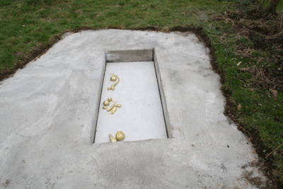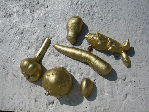 Mehr noch als um die Konstruktion einer archäologischen Fiktion geht es den Künstlern De Bernardo und Mozzini aber um das Spiel mit dem Ausstellungsort, dem Bauernhof, also dem Ort, an dem die für die Entwicklung und das Schicksal unserer Zivilisation so bedeutsame bäuerliche Arbeit stattfindet. Dabei unterstreichen sie dessen Symbolhaftigkeit, und zwar nicht nur im Kontext der heutigen Gesellschaft, sondern letztlich mehr oder weniger der ganzen Zivilisation von der Vorzeit bis in die Gegenwart. Warum sollte es eigentlich undenkbar sein, dass ein Volk, statt die Jagd zu preisen und den Krieg zu feiern, das Gemüse in den Mittelpunkt seiner sakralen Bilderwelt stellt, also Knollen, Zwiebeln und Wurzeln, die die bäuerliche Praxis am besten symbolisieren? Natürlich gibt es in der abendländischen Kunstgeschichte immer wieder Beispiele von Darstellungen bäuerlicher Arbeit bis hin zu ihrer Apotheose in den Genrebilder der flämischen Malerei, die der Entwicklung des Stillebens voranging. Trotzdem schneiden die Knollen, Wurzeln und Zwiebeln sogar im reich variierten Panorama der Stilleben schlecht ab, was vielleicht auch an ihrer moralisierenden Art liegt, da es ja vorwiegend um die Allegorie der Vergänglichkeit ging. Die Meister dieses Genres gaben eher Obst in kräftigen Farben und üppigen Blumen den Vorzug, um so die Flüchtigkeit des materiellen Lebens stärker zu betonen. Aber vielleicht auch, scheinen uns die Künstler De Bernardo und Mozzini zu sagen, weil die Menschen unmittelbare Freuden stets bevorzugten, also lieber im Sonnenlicht wachsendes süsses Obst und hübsche Blumen priesen. Das weniger elegante und nicht gerade dekorative Wurzelgemüse wurde trotz seiner grundlegenden Bedeutung für die Ernährung vernachlässigt, vergessen und, so wie es aus dem Versteck unter der Erde auf die Welt kam, beinahe verborgen gehalten. Das Werk ist weniger die Inszenierung eines unwahrscheinlichen architektonischen Funds als vielmehr die Hommage an Gemüse, das in der abendländischen Bilderwelt oft vergessen wird. Die Künstler bringen es ans Licht der Sonne und verherrlichen es durch den Prozess des Vergoldens, so wie das Vergolden in der byzantinischen Kunst dazu diente, die heiligen Elemente einer Komposition hervorzuheben. Analog dazu ist es auch eine Hommage an die bäuerliche Arbeit im Allgemeinen und speziell an den Ort des Kunstwerks: den Bauernhof der Familie Blum, der dank des Engagements des Künstlers und Kurators Martin Blum seit einigen Jahren als provokativer Ausstellungsort der anderen Art dient, an dem eingeladene Künstler in ungewöhnlichen Räumen Werke schaffen, und der zugleich urbanes Publikum in die Peripherie lockt. Die alte Dichotomie des Nebeneinanders von Kultur und Natur könnte nicht besser illustriert werden.